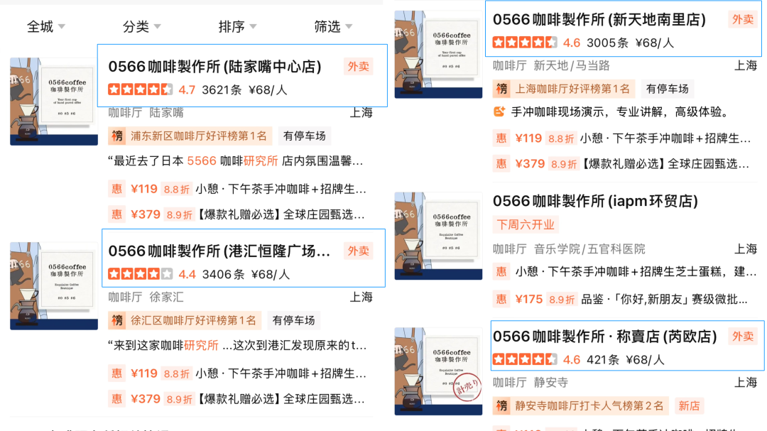 大众点评上,这4家店的评分多在4.5,其中2家门店已有数千条评论,“口感好”“体验惊艳”出现频次高。还有很多人一边说“这是上海最贵的手冲咖啡”,一边要“再次回购”。