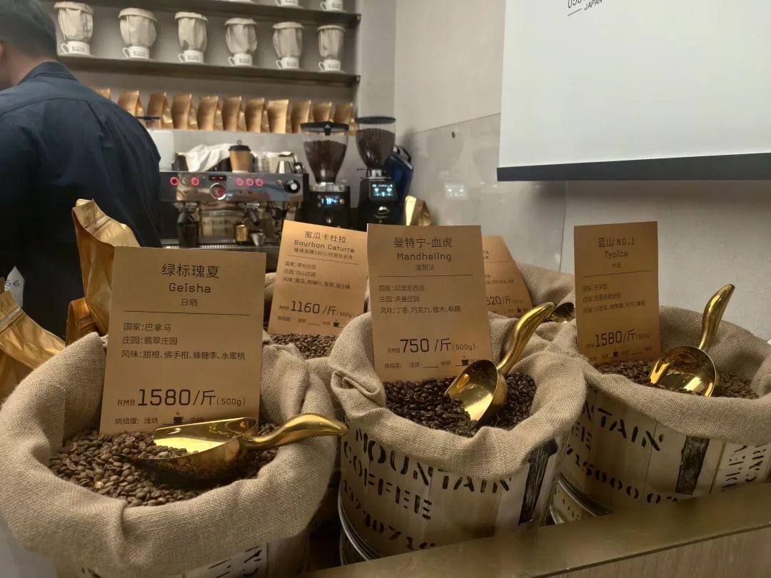 这是一家“很难错过”的咖啡店,整个吧台都被咖啡熟豆摆满,一麻袋一麻袋的瑰夏码放在一起,插着显眼的价格标签,1580元一斤,明码标价,童叟无欺。